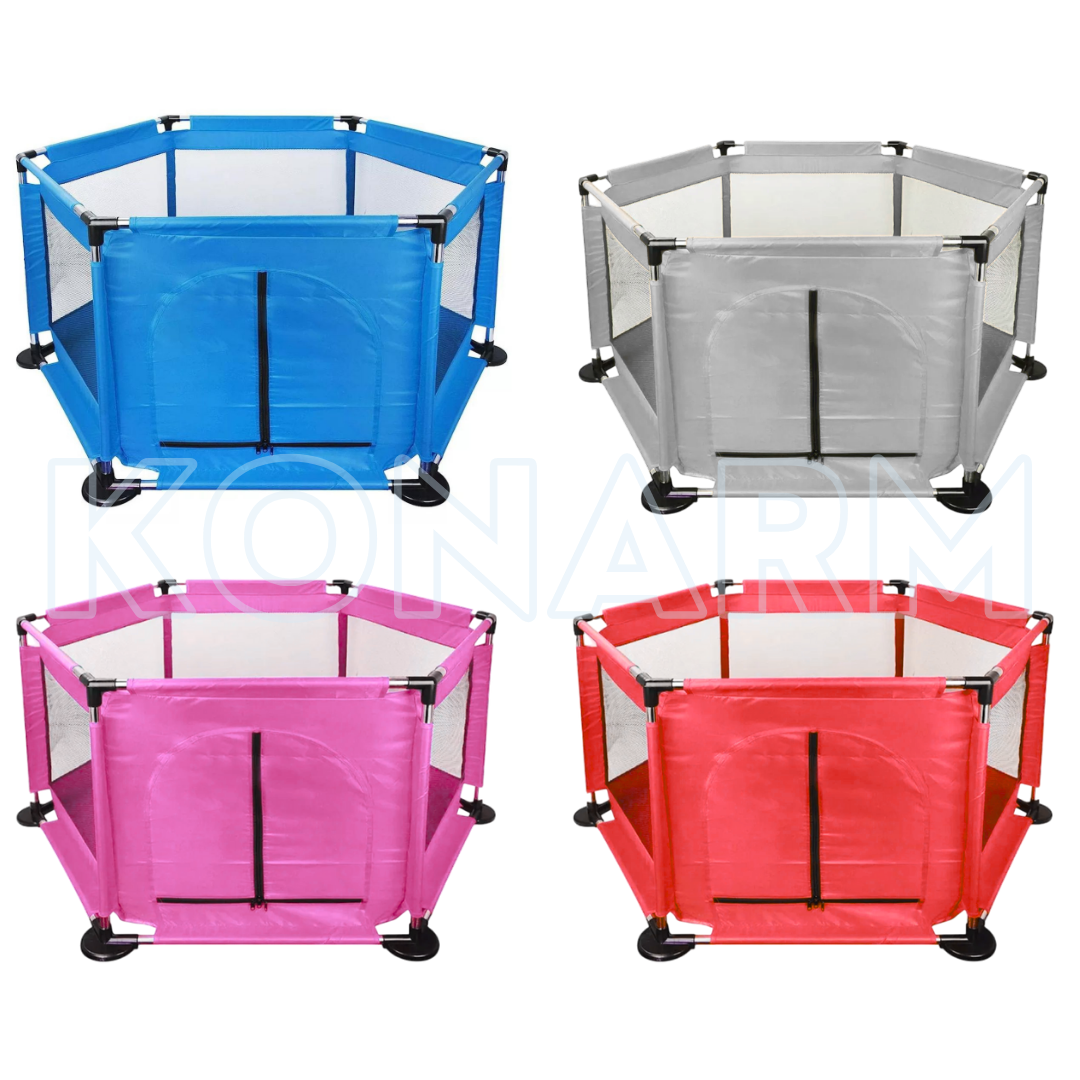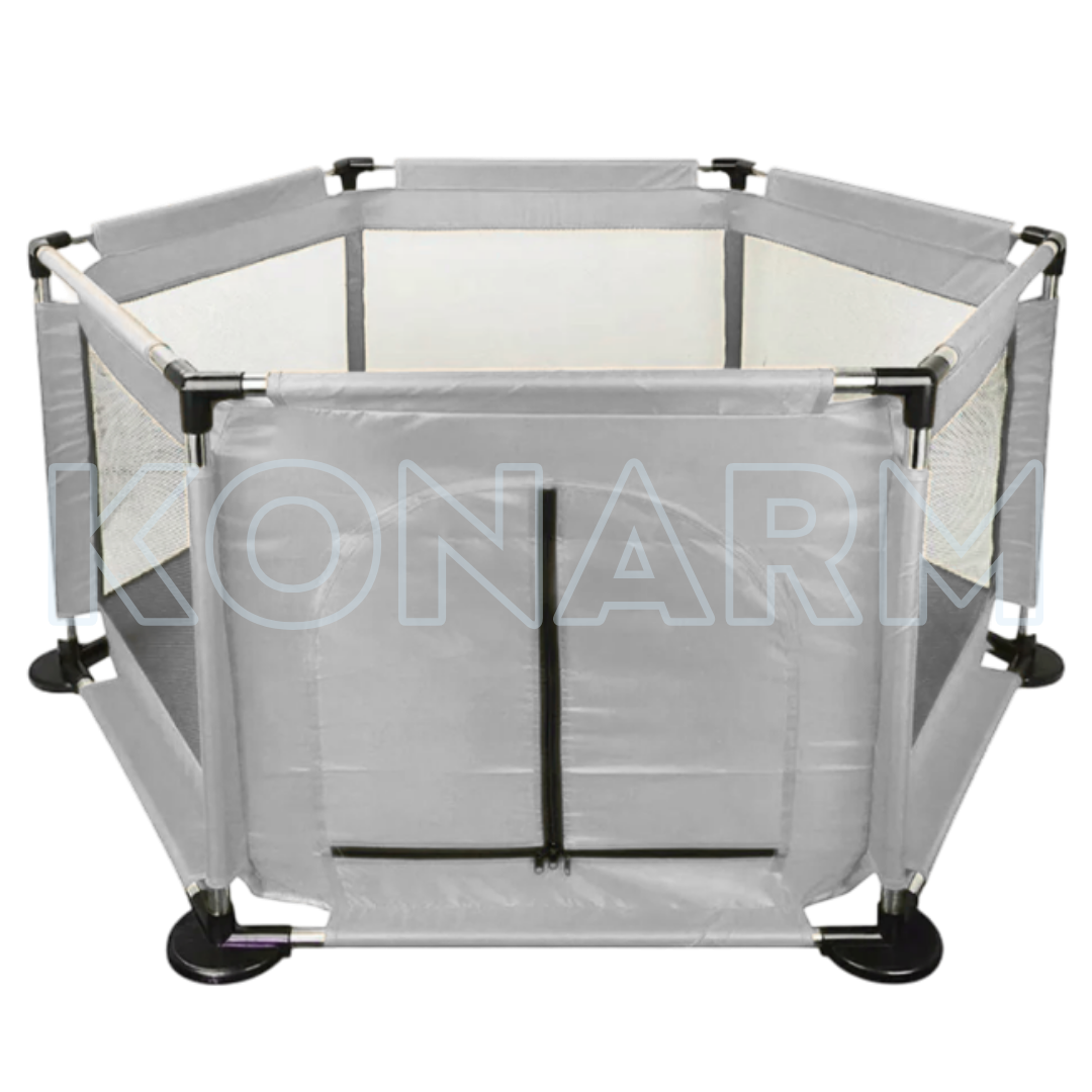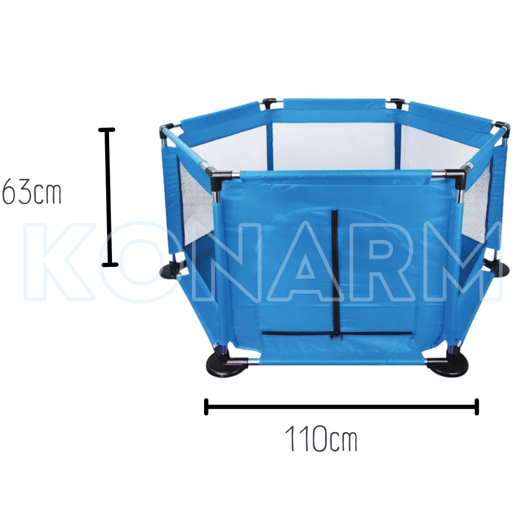 Corralito hexagonal ideal para bebés o niños pequeños. Fabricado con materiales resistentes, malla transpirable para visibilidad y ventilación, y puerta con cremallera para fácil acceso. Incluye ventosas de seguridad en la base. Medidas: 110 cm de ancho x 65 cm de alto.