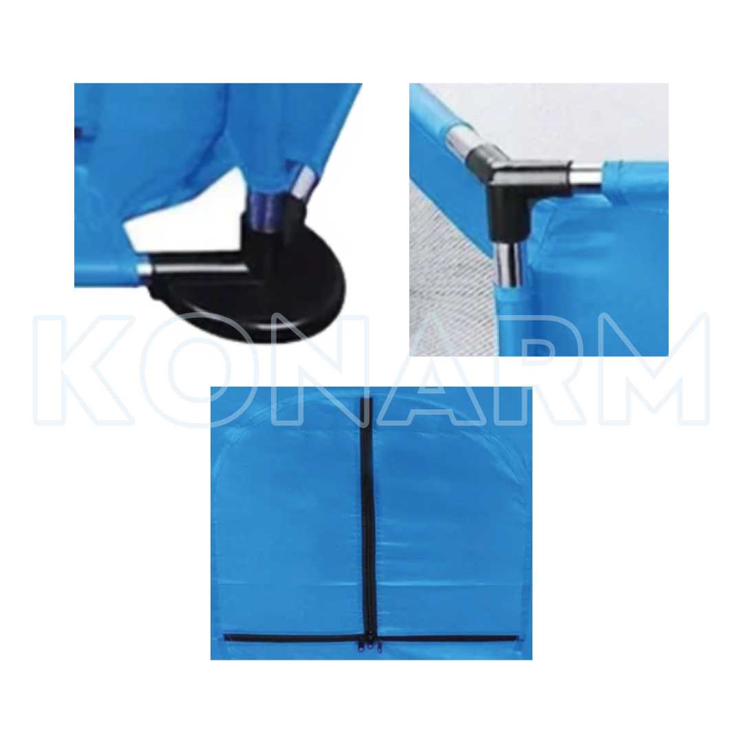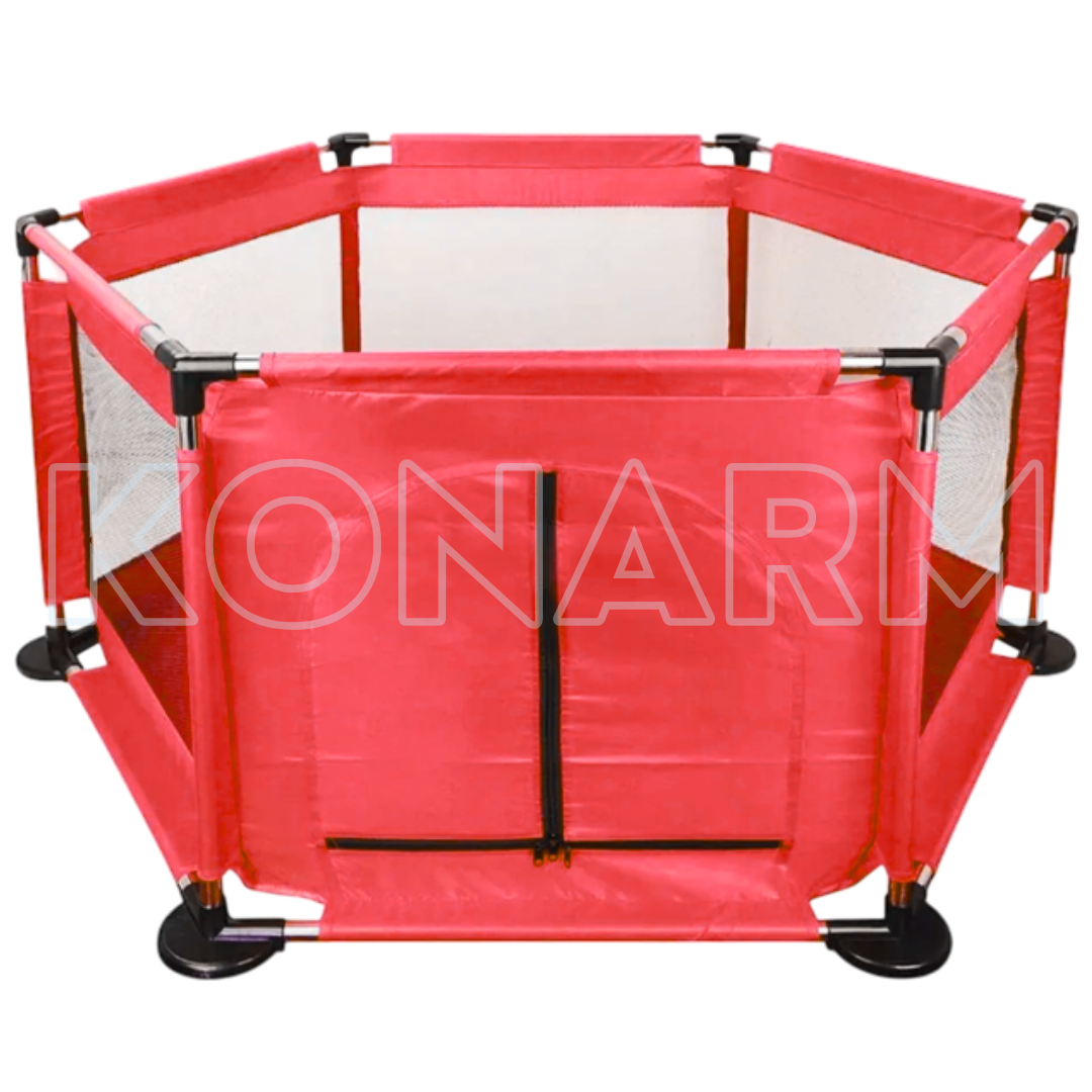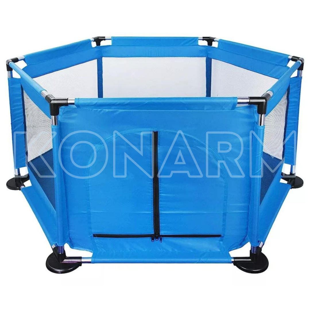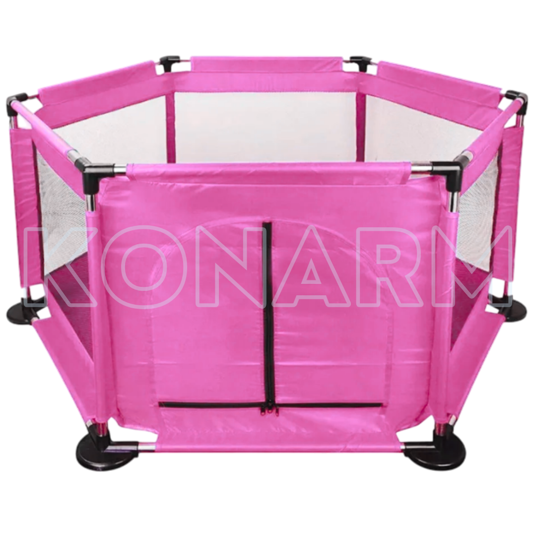 Corralito hexagonal ideal para bebés o niños pequeños. Fabricado con materiales resistentes, malla transpirable para visibilidad y ventilación, y puerta con cremallera para fácil acceso. Incluye ventosas de seguridad en la base. Medidas: 110 cm de ancho x 65 cm de alto.