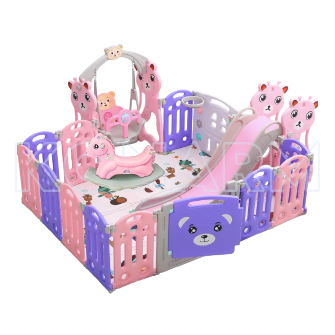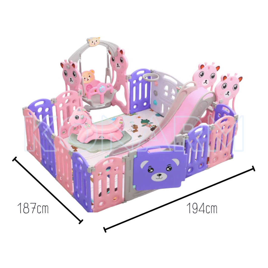 Más que un corral, es un centro de juegos para tu bebé. Incluye resbaladera, columpio, caballito balancín y accesorios interactivos que estimulan el desarrollo y la creatividad. Fabricado en plástico de alta calidad, con bordes redondeados y sistema de bloqueo seguro, garantiza resistencia y estabilidad. Su amplio espacio de 187cm x 194 cm permite a tu pequeño moverse, jugar y divertirse con total tranquilidad.