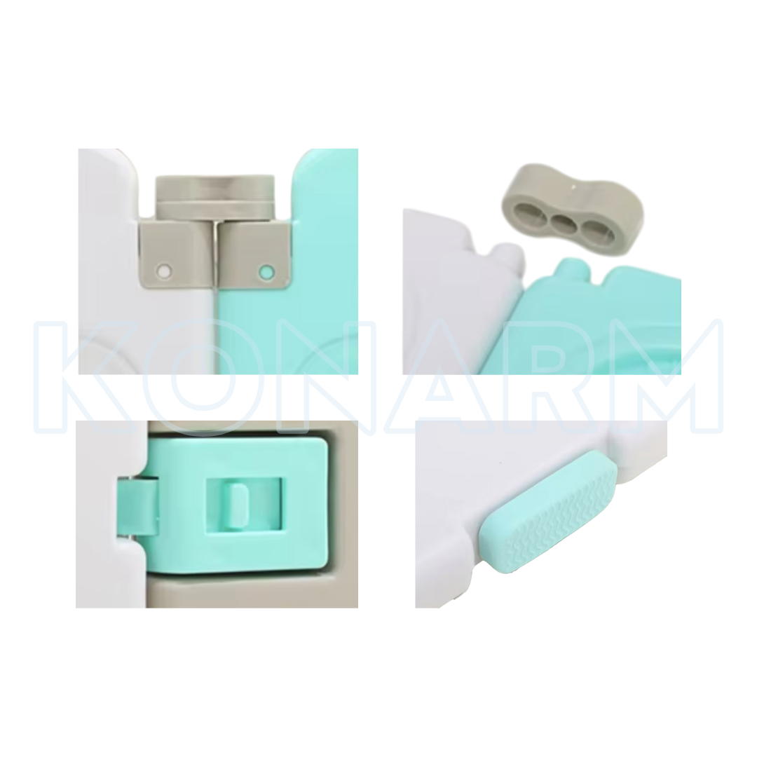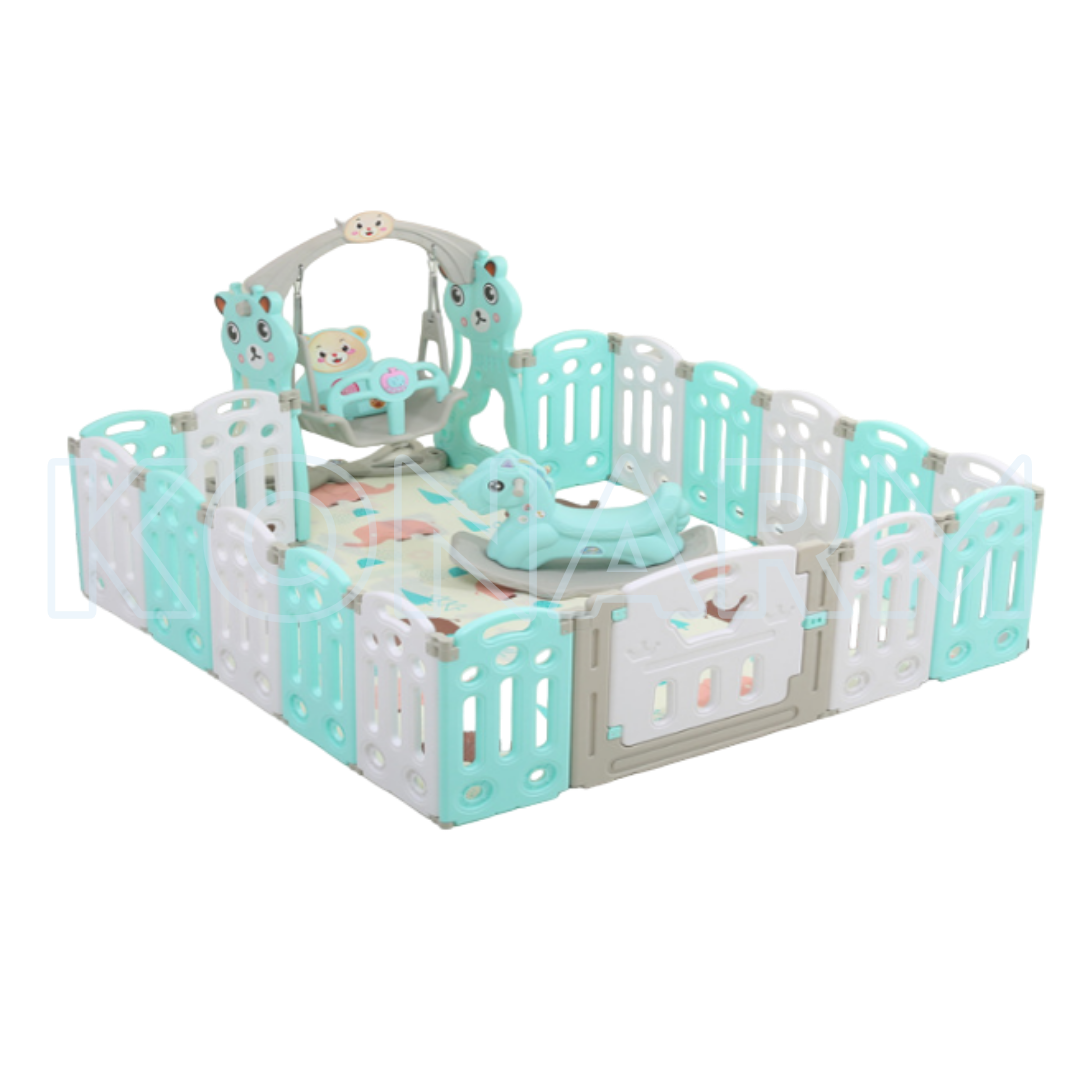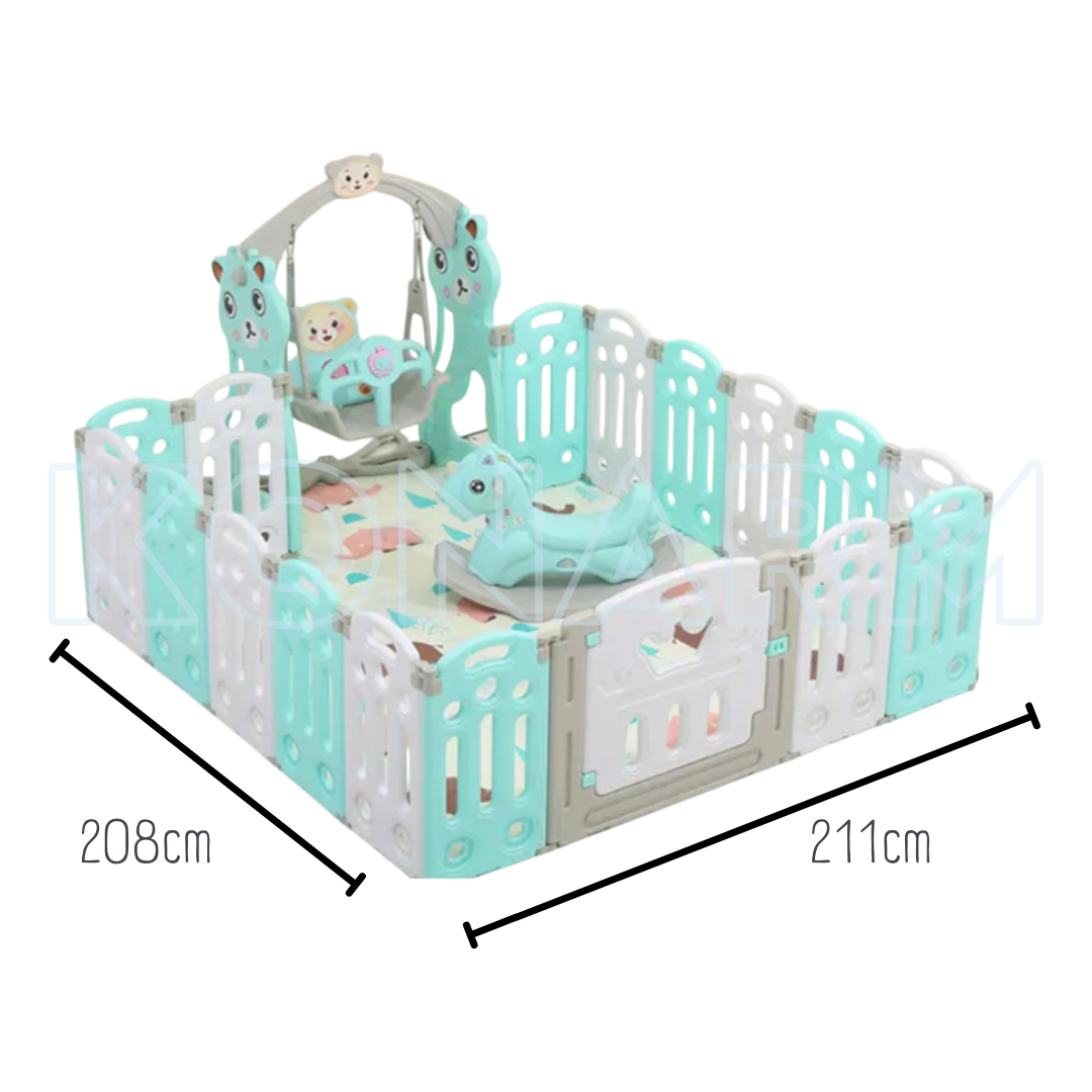 Más que un corral, es un centro de juegos para tu bebé. Incluye columpio, caballito balancín y accesorios interactivos que estimulan el desarrollo y la creatividad. Fabricado en plástico de alta calidad, con bordes redondeados y sistema de bloqueo seguro, garantiza resistencia y estabilidad. Su amplio espacio de 208 cm x 211 cm permite a tu pequeño moverse, jugar y divertirse con total tranquilidad.