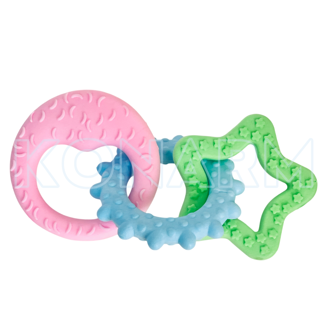 Tres veces más diversión: muerde, juega y cuida sus dientes con un solo mordedor.
