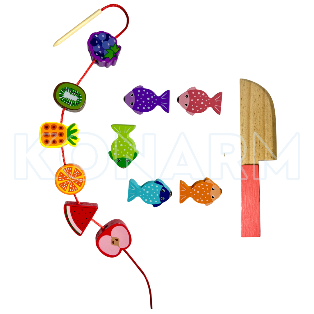 - Juego de ensarte: Incluye piezas con cuerda para desarrollar la motricidad fina y la concentración.