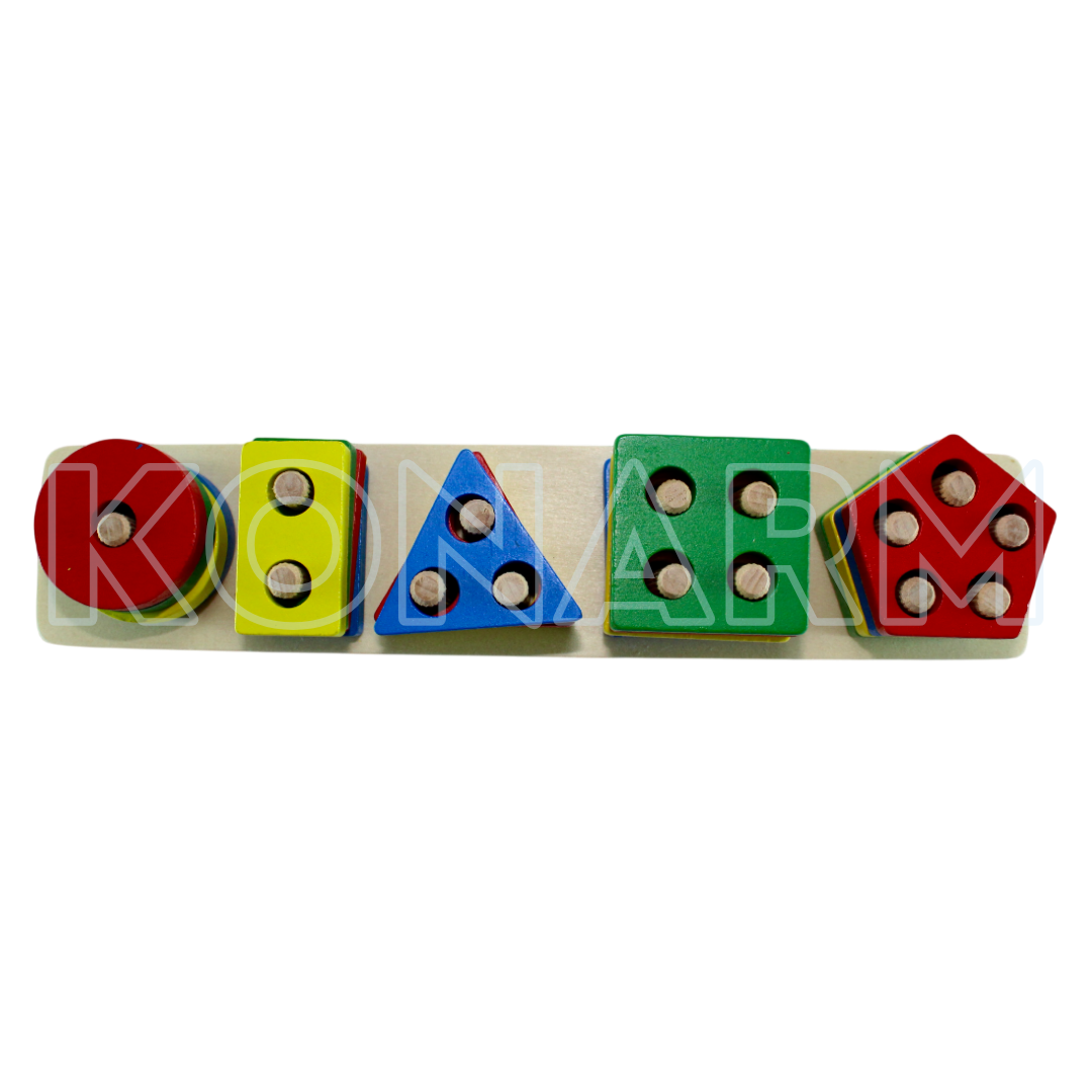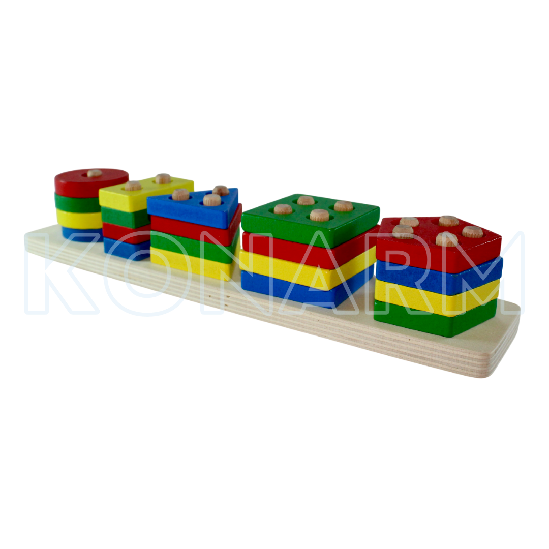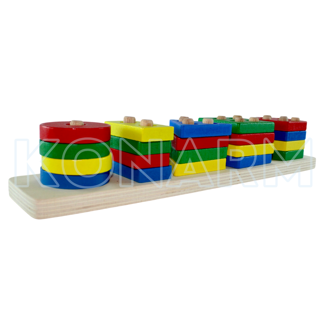 Juego de apilamiento con figuras geométricas (círculo, cuadrado, triángulo, hexágono) en diferentes colores. Ideal para mejorar la coordinación y el pensamiento lógico.