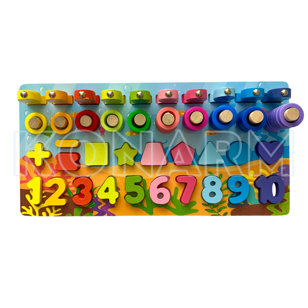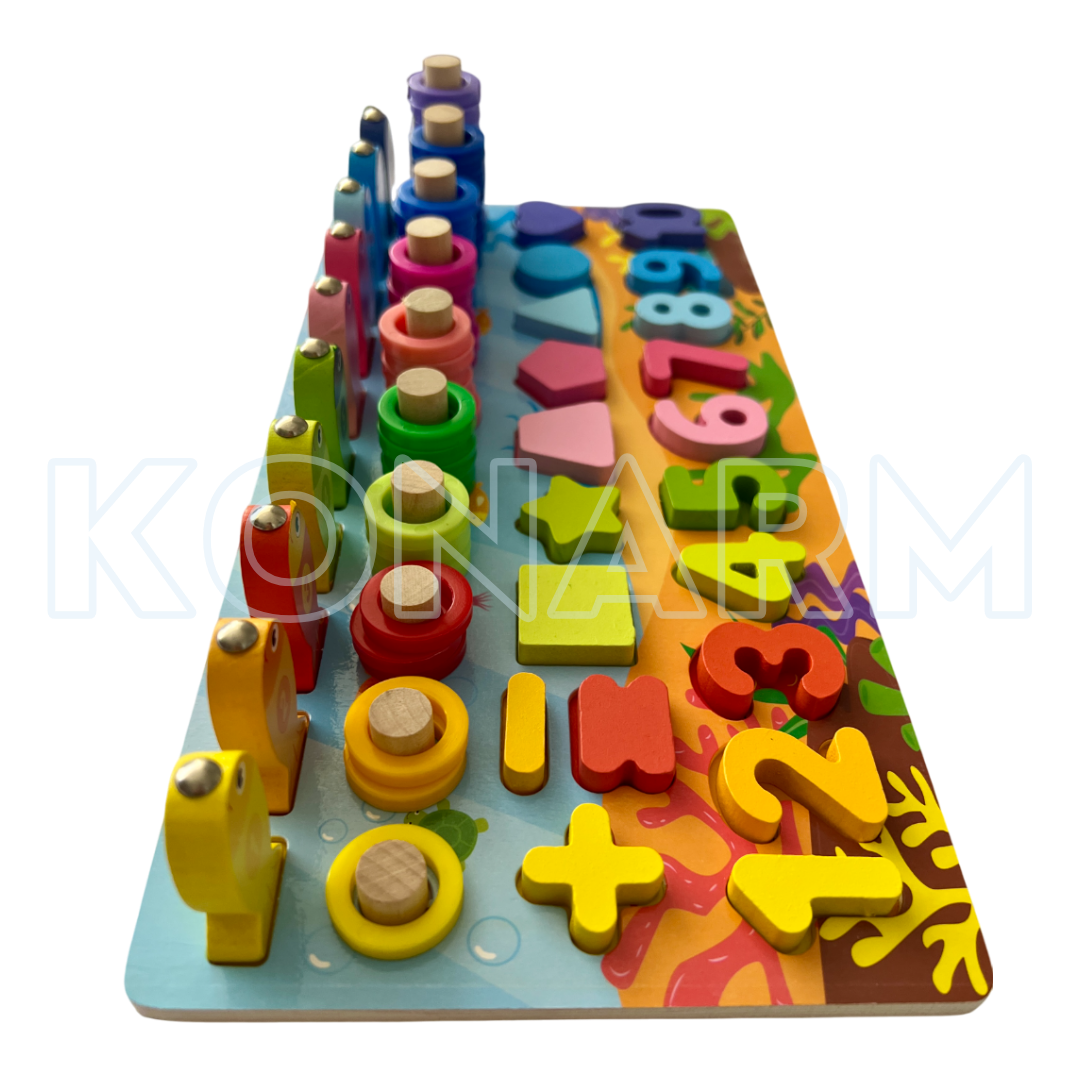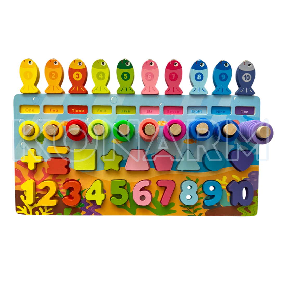 Un completo tablero de madera que incluye números del 1 al 10, aros para conteo, piezas geométricas, símbolos matemáticos y juego de pesca magnética. Estimula habilidades cognitivas, coordinación motriz y aprendizaje temprano de matemáticas.