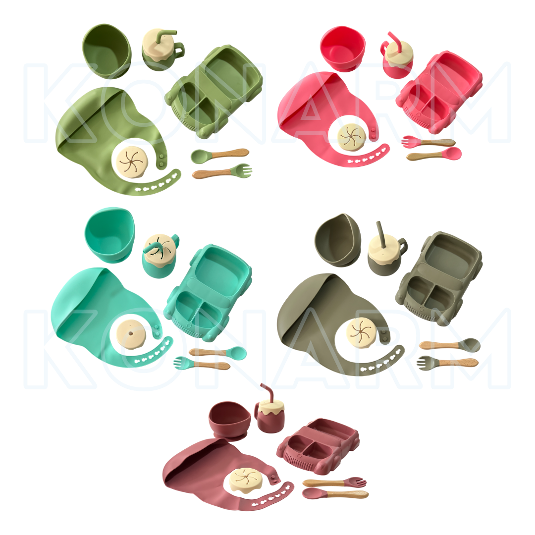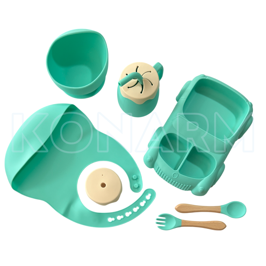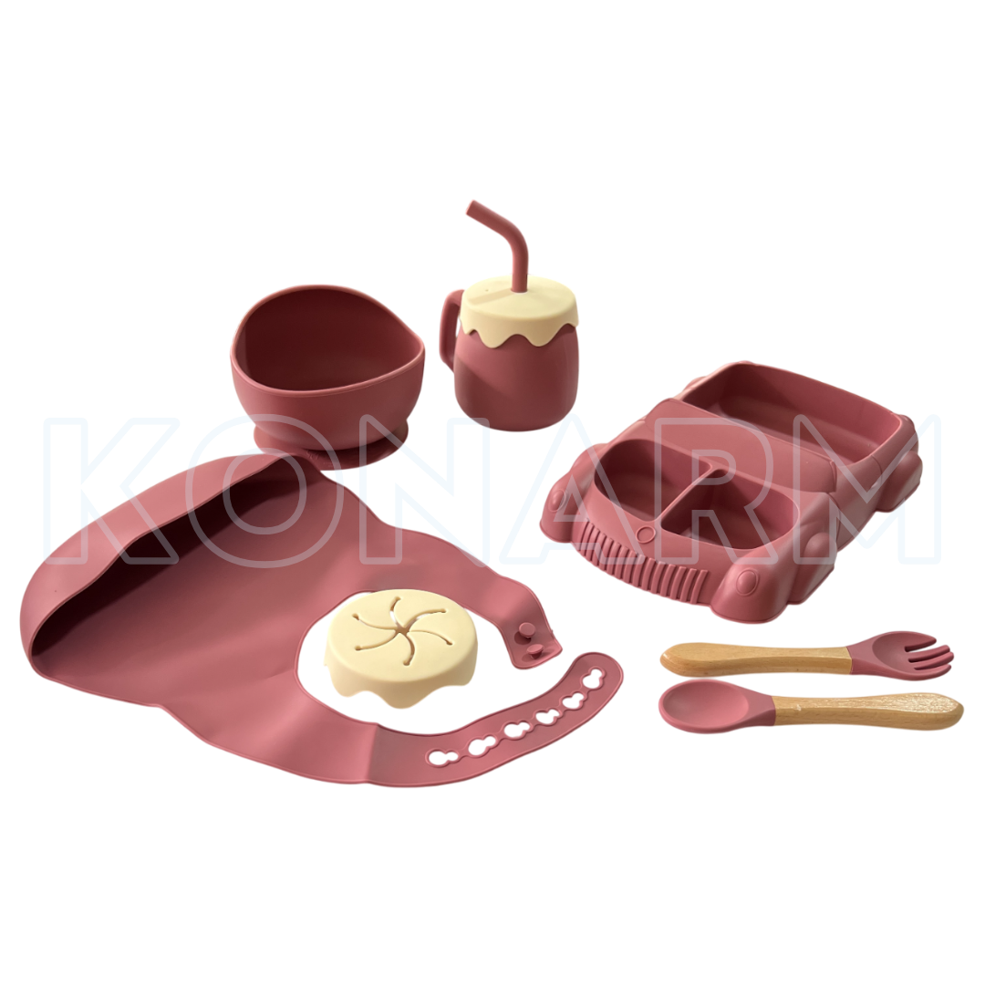 Set completo con platos en forma de ardilla, babero, vaso antiderrames, cubiertos de silicona y bowl con ventosa. Ideal para bebés a partir de los 6 meses.