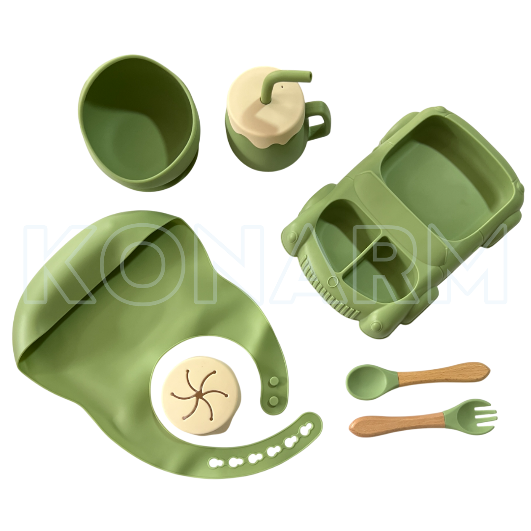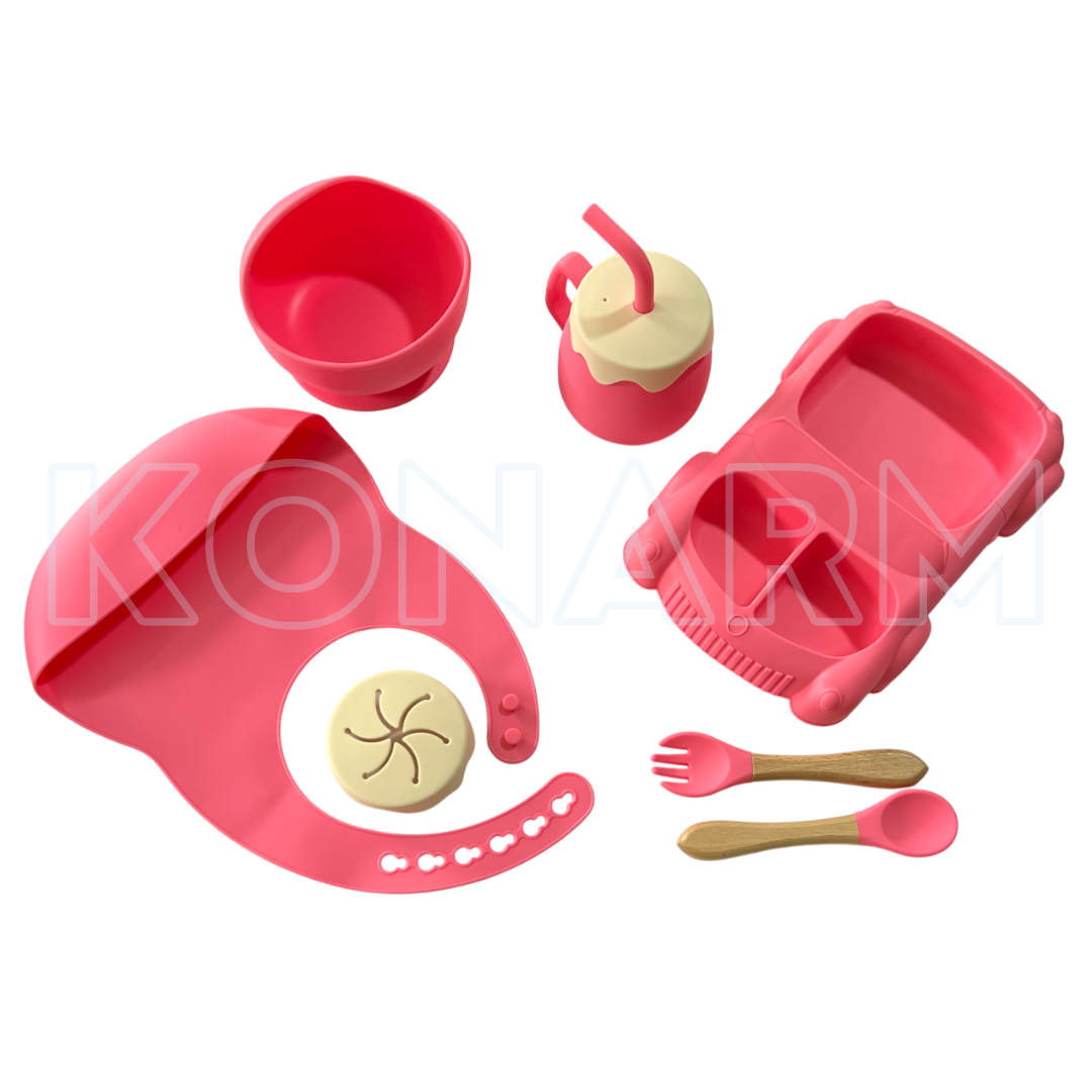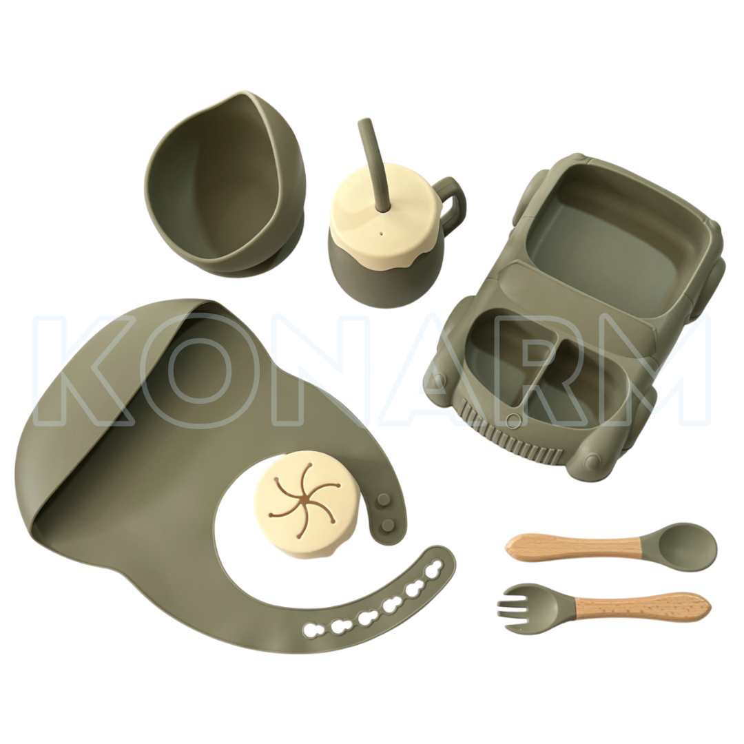 Set completo con platos en forma de ardilla, babero, vaso antiderrames, cubiertos de silicona y bowl con ventosa. Ideal para bebés a partir de los 6 meses.