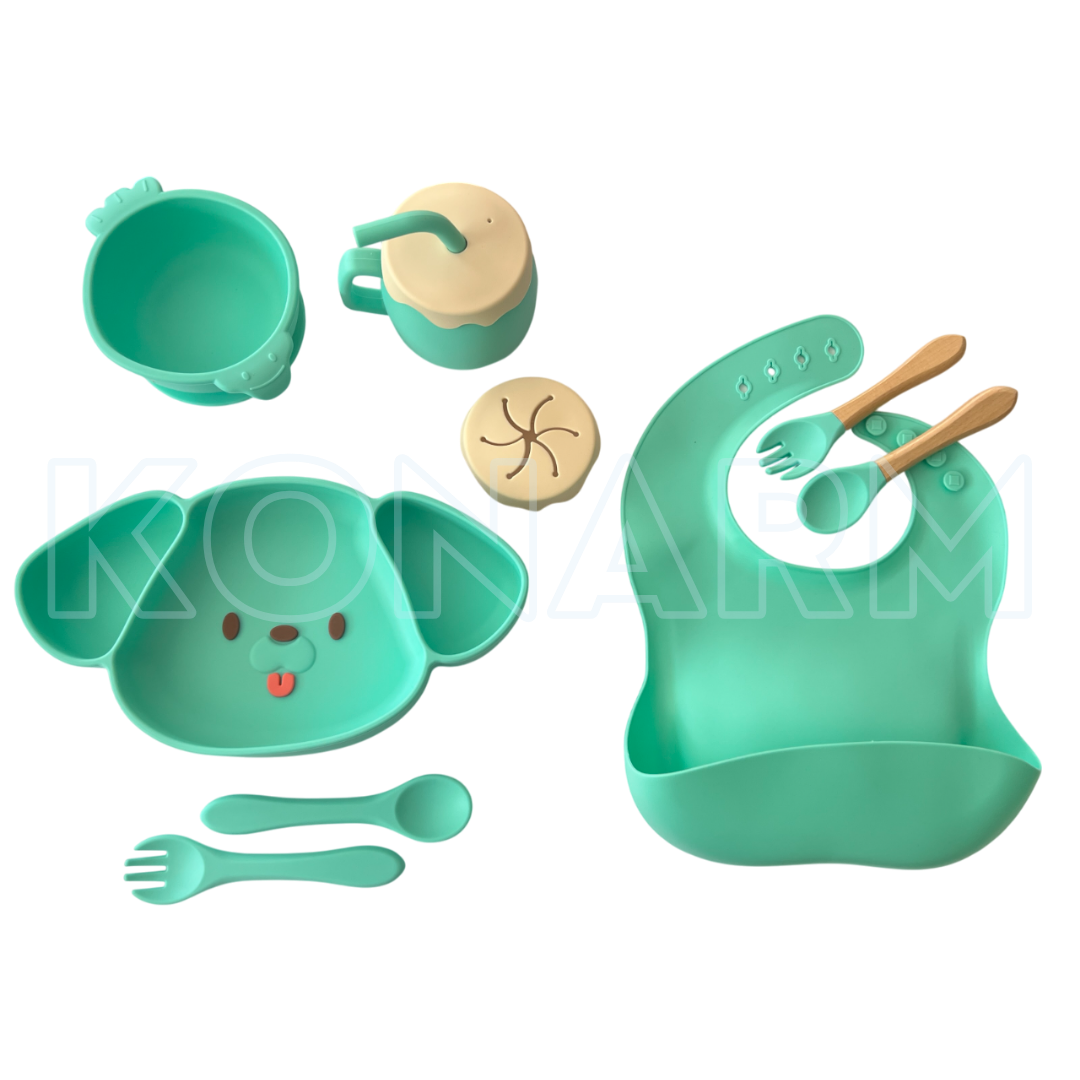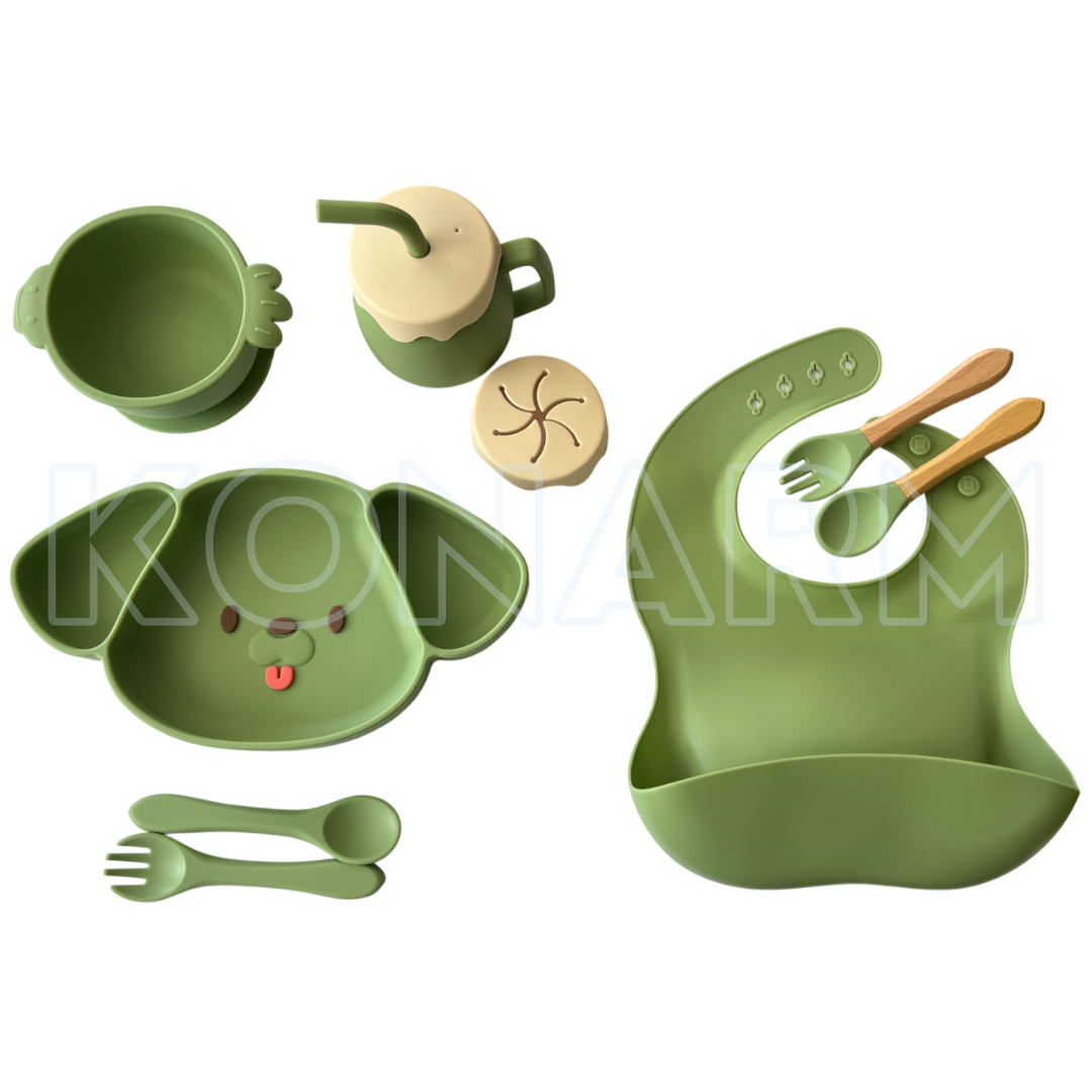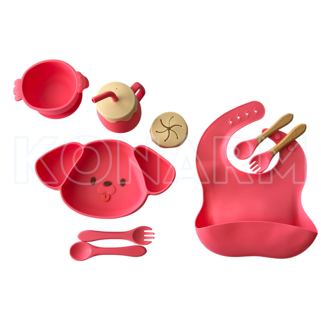 Un completo kit con babero, plato, bowl, vaso con tapa, cuchara y tenedor, todos con diseño de carita de perrito. Ideal para bebés a partir de los 6 meses.