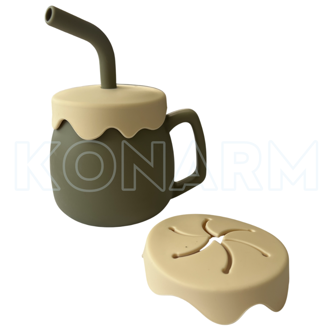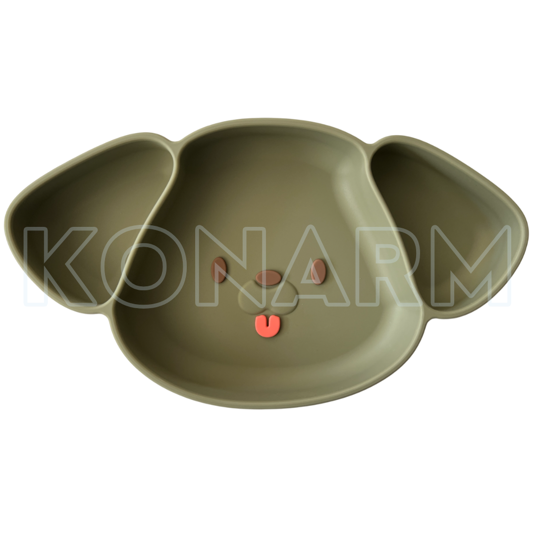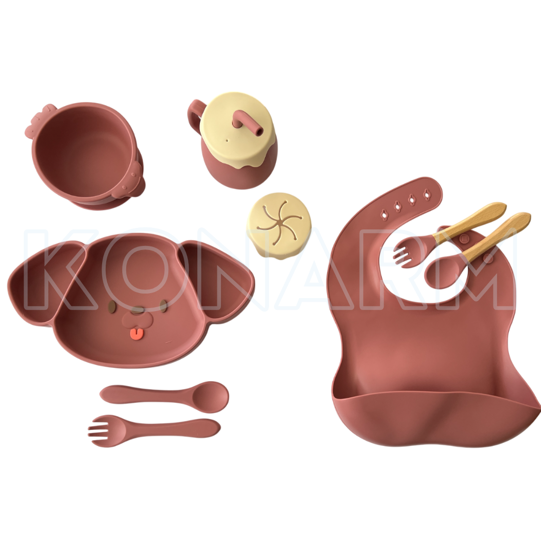 Un completo kit con babero, plato, bowl, vaso con tapa, cuchara y tenedor, todos con diseño de carita de perrito. Ideal para bebés a partir de los 6 meses.