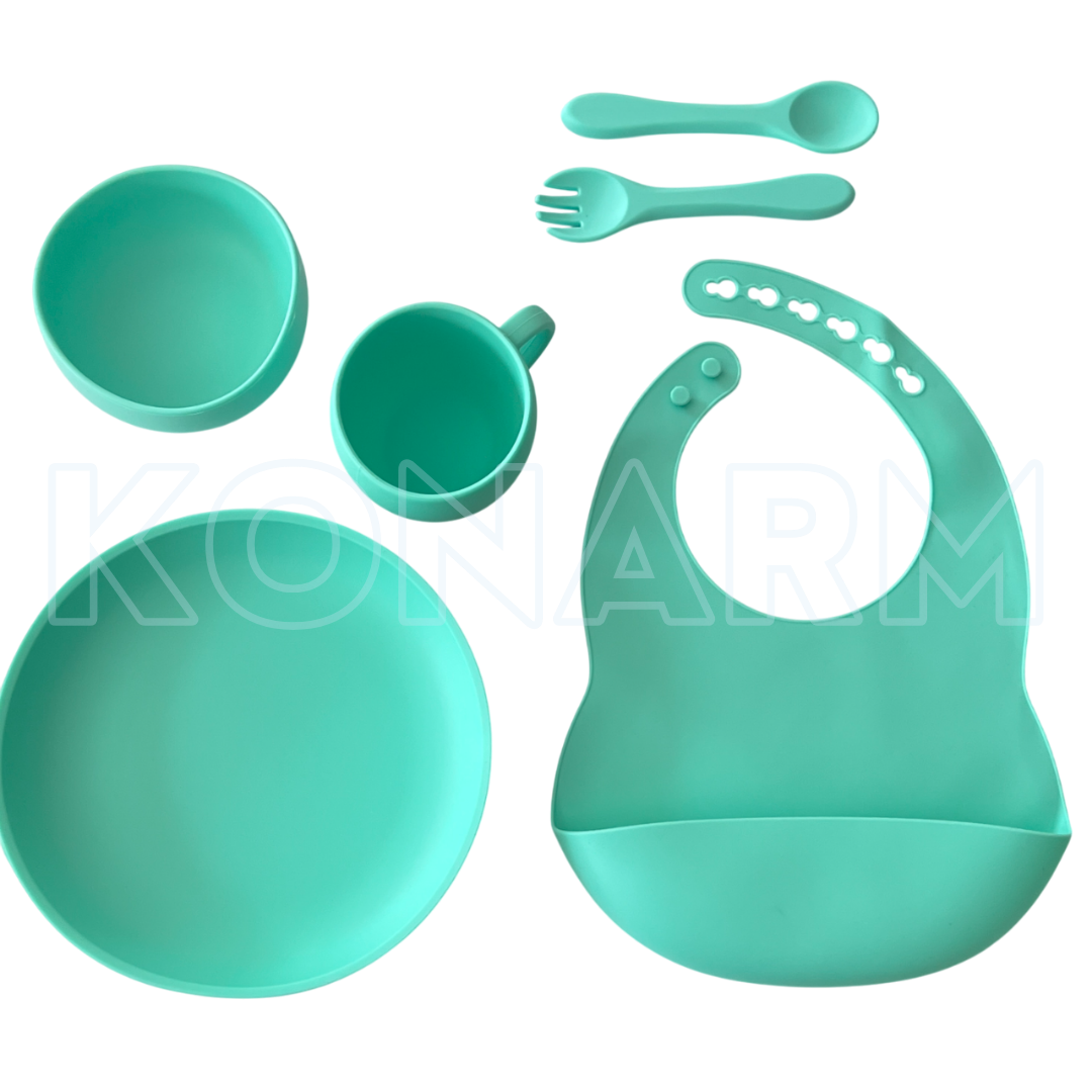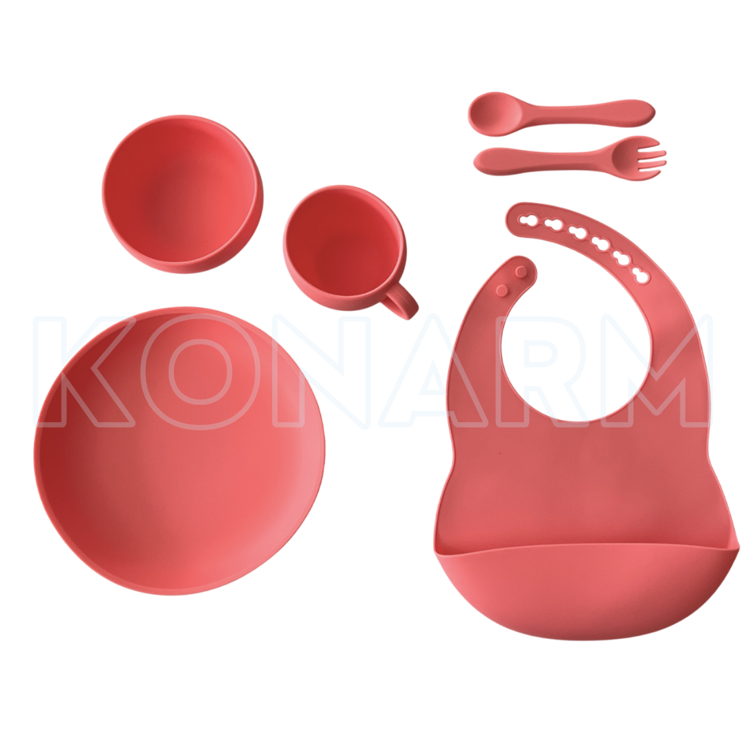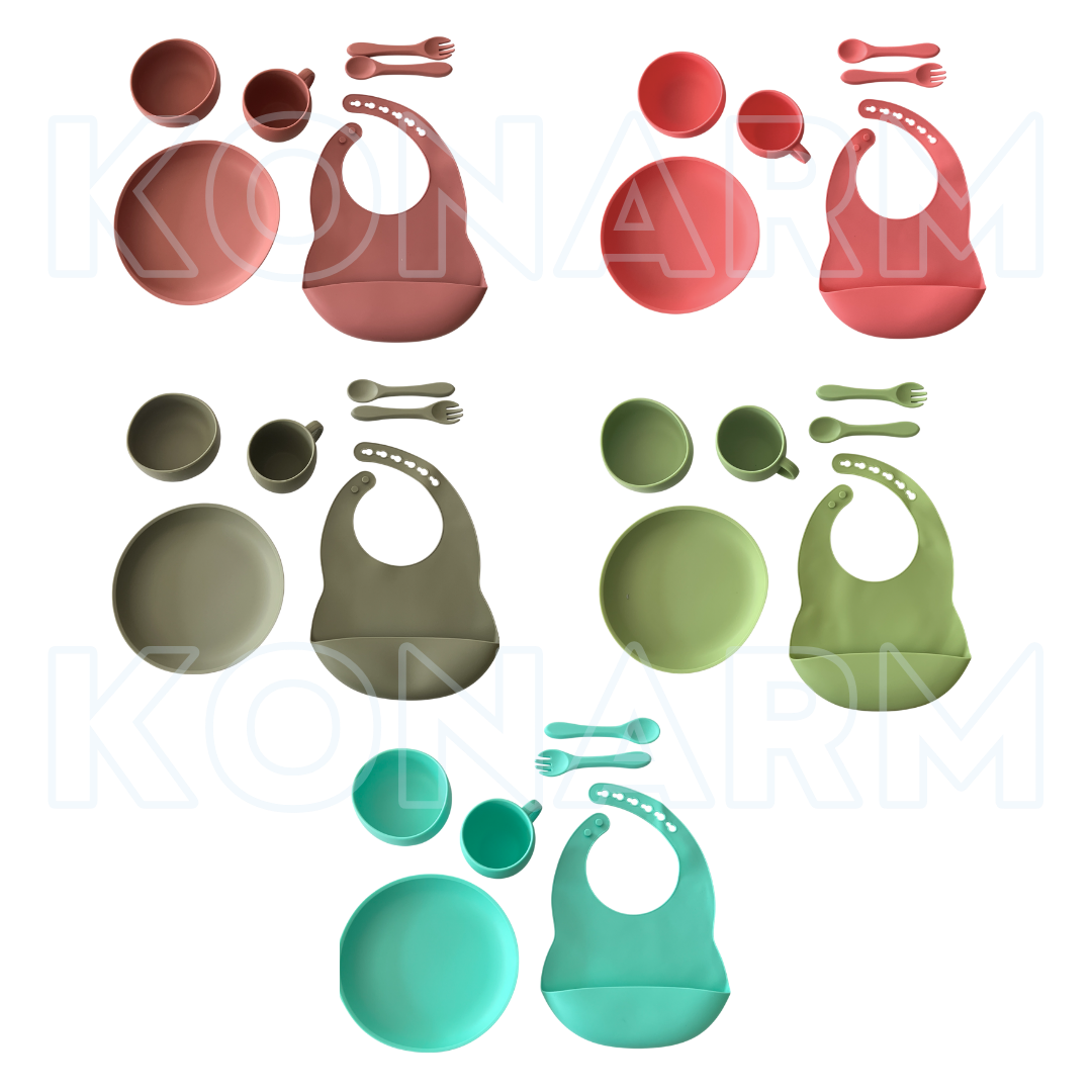 Este set incluye babero de silicona con bolsillo, bowl con ventosa, plato dividido, vaso con tapa y sorbete, y cuchara de silicona. Ideal para bebés a partir de los 6 meses.