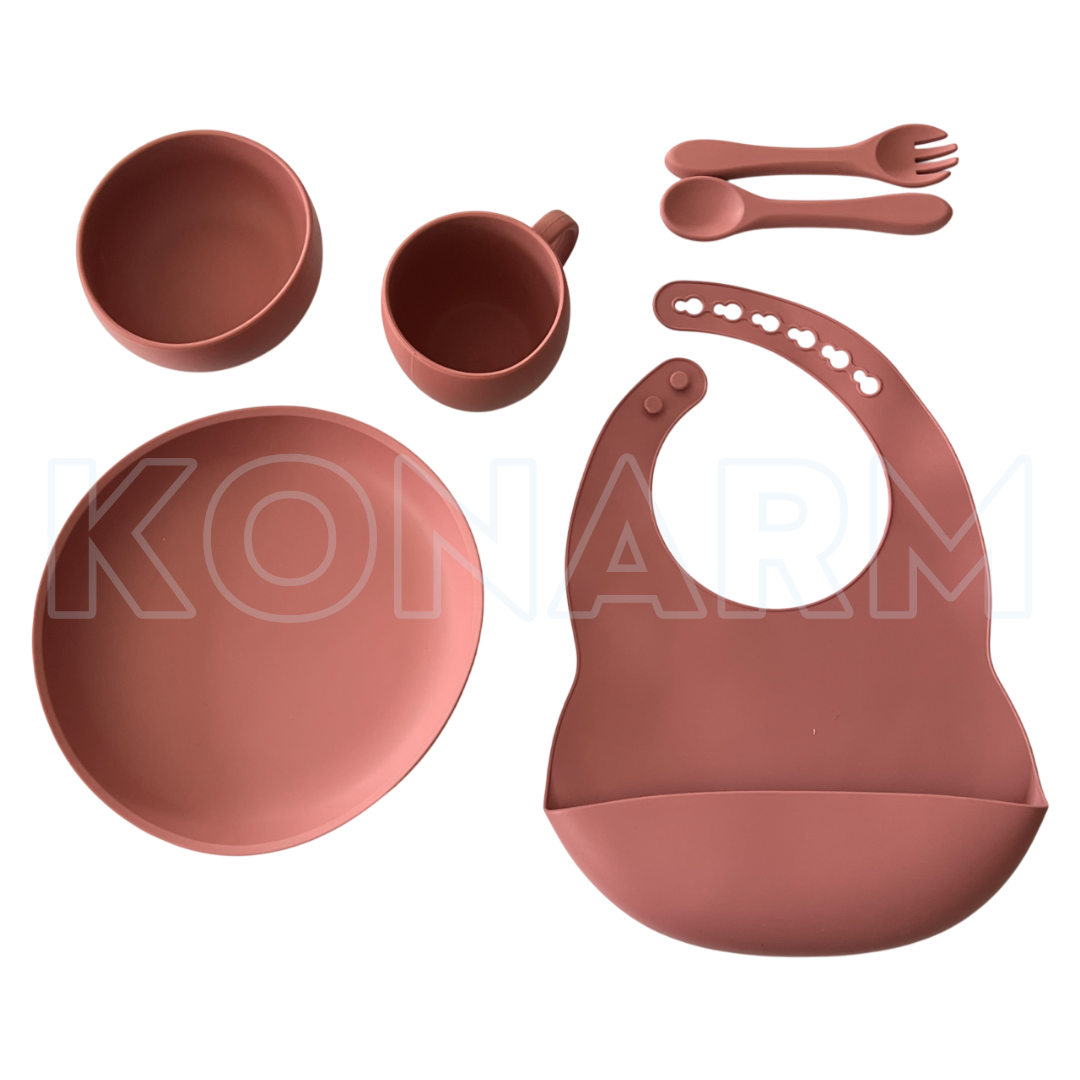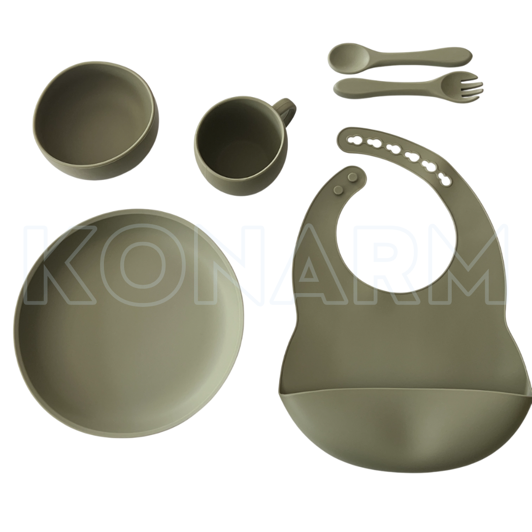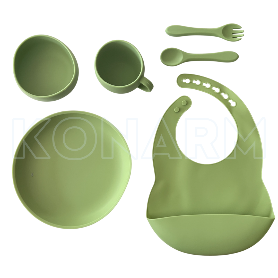 Este set incluye babero de silicona con bolsillo, bowl con ventosa, plato dividido, vaso con tapa y sorbete, y cuchara de silicona. Ideal para bebés a partir de los 6 meses.