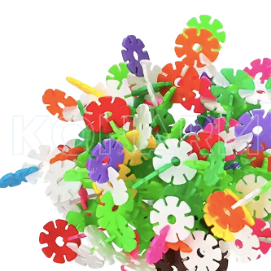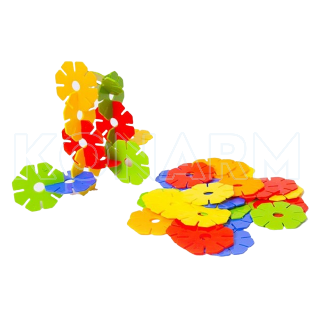 Discos encajables con forma de flor, ideales para armar figuras, mosaicos y estructuras creativas llenas de color.