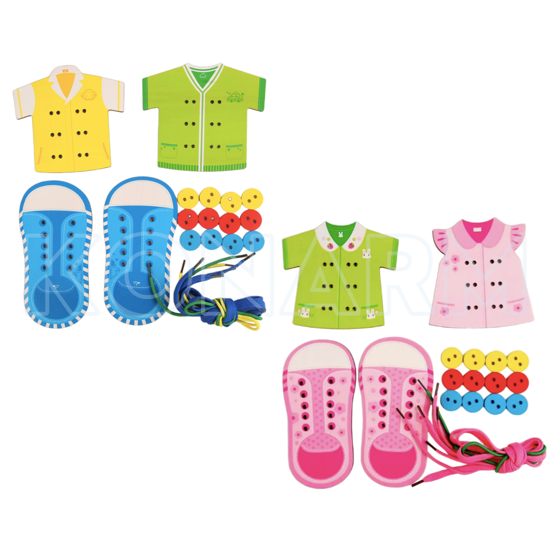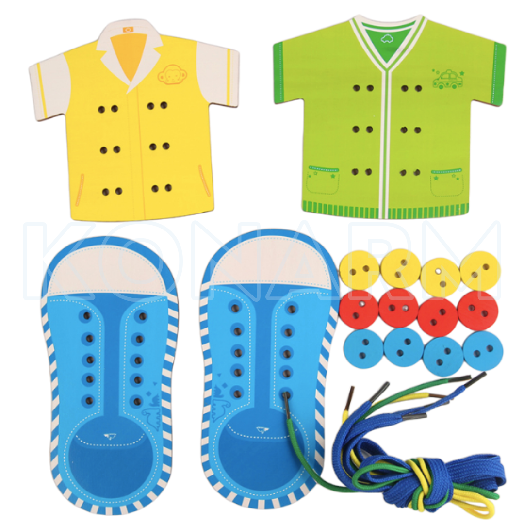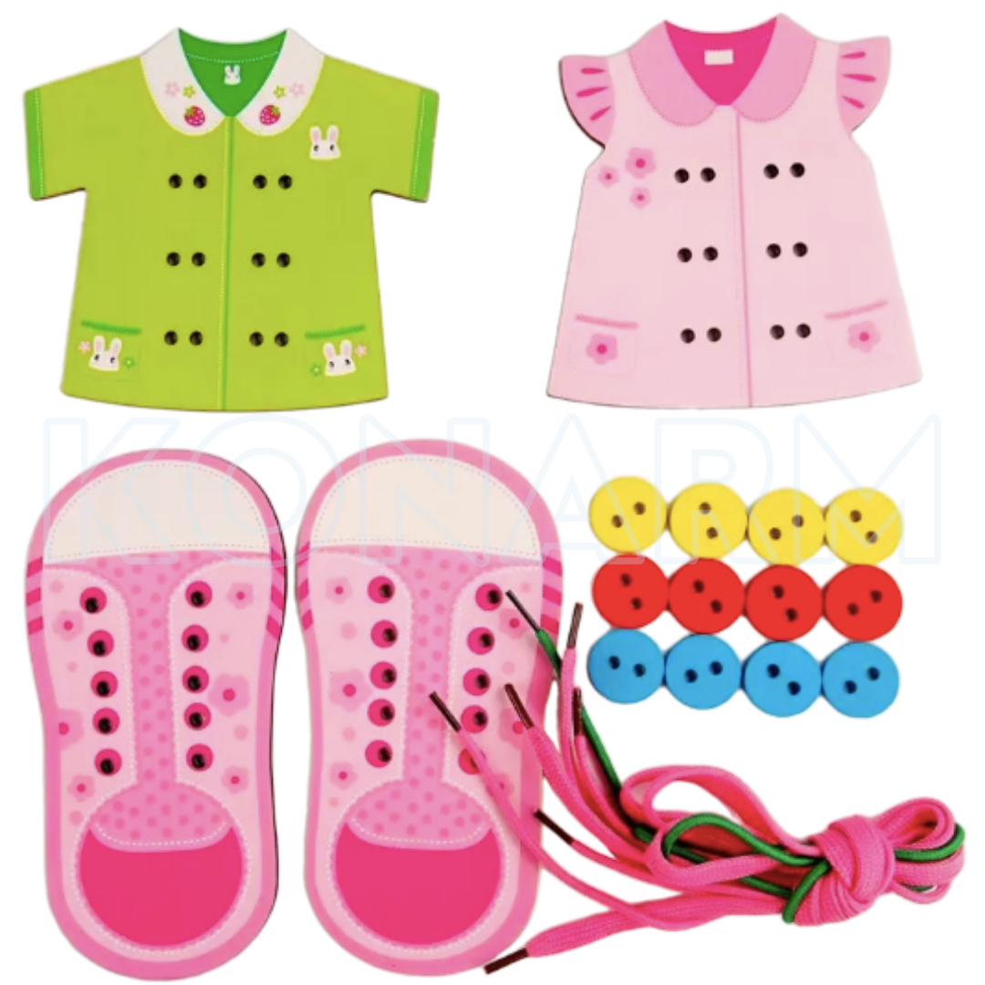 Juego didáctico que fomenta el conteo, la clasificación y la coordinación ojo-mano a través de prendas, cuentas y cordones de colores.